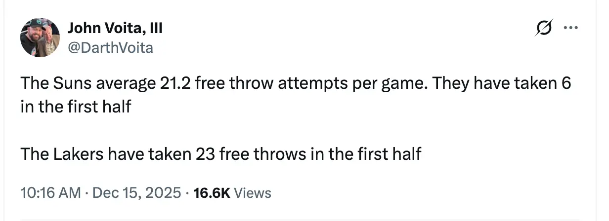 太陽平均每場 21.2次罰球,但他們上半場只有 6 次。