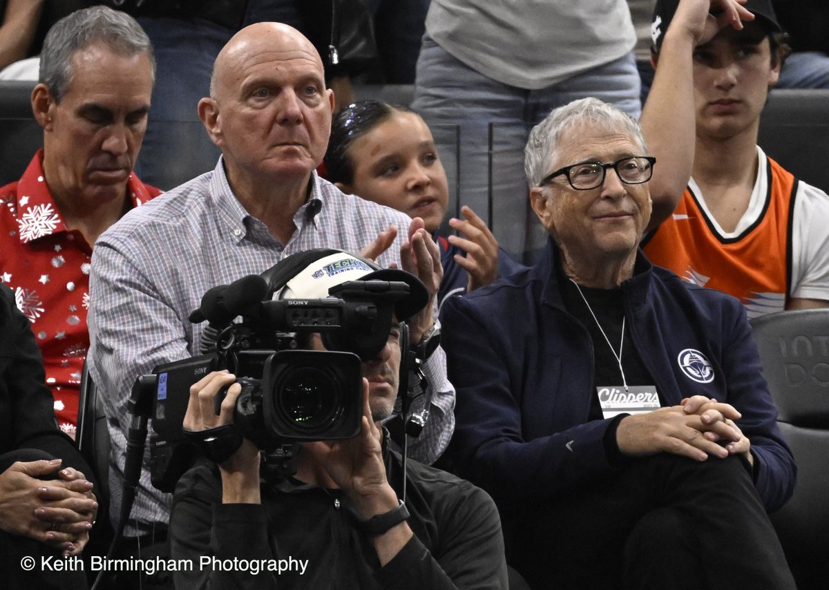 Los Angeles Clippers owner, Steve Ballmer, left, with Bill Gates look on as