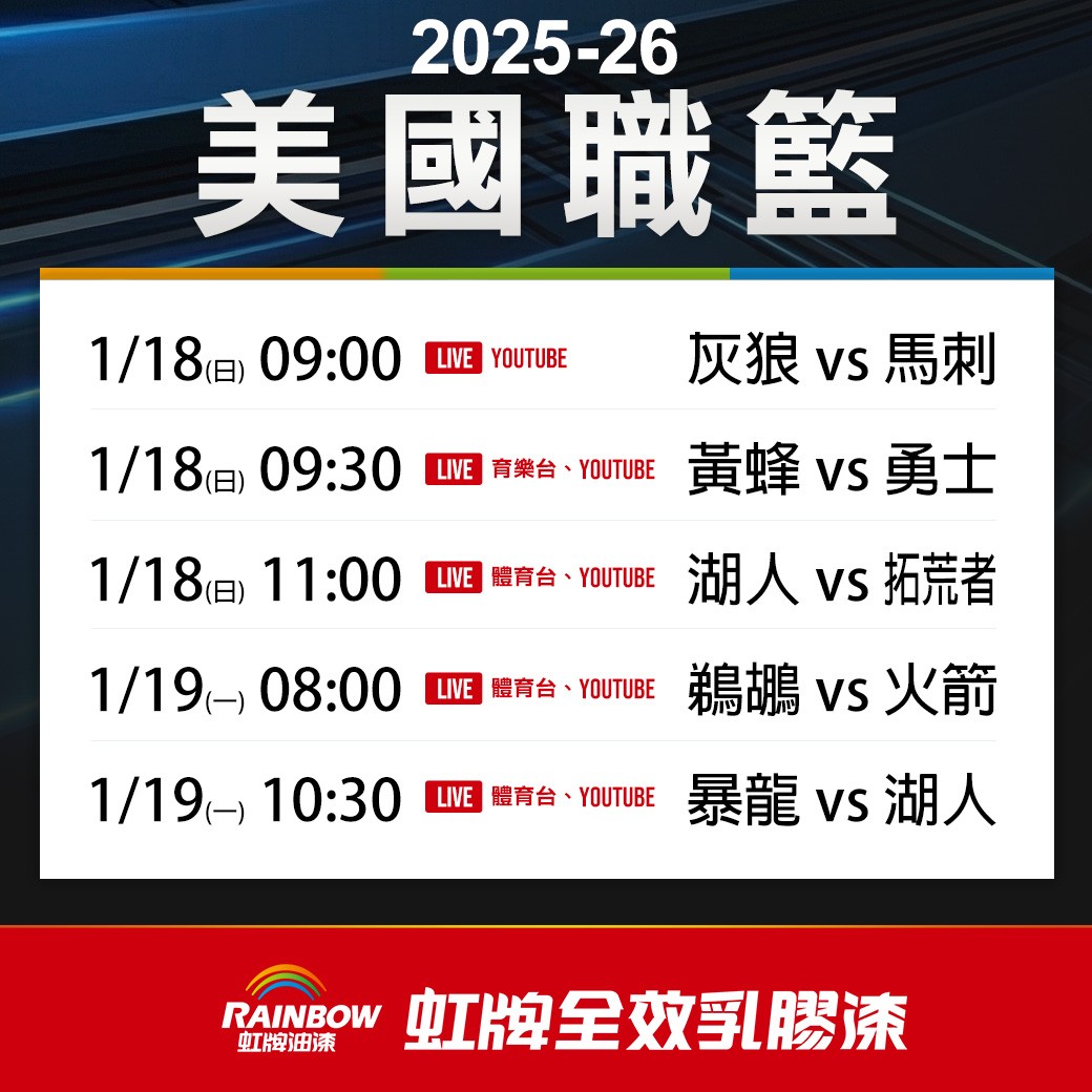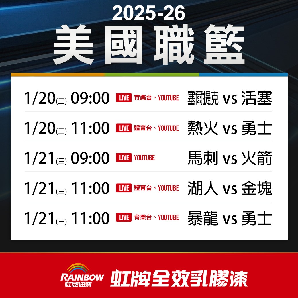 │ 2025-26 例行賽 (台灣時間) ESPN NBC Peacock Amazon Taiwan 緯來 │
