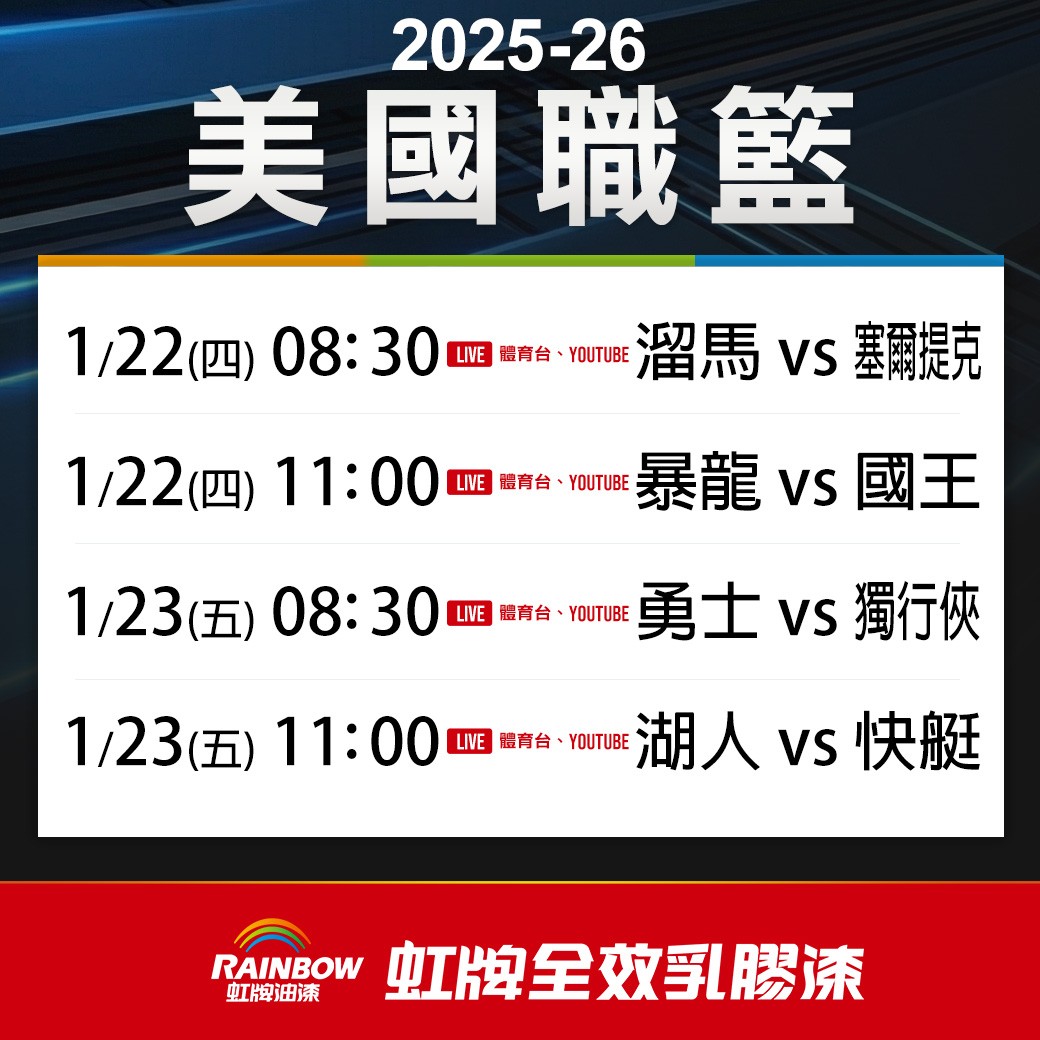 │04:00 快艇 @ 灰狼 │08:30 公鹿 @ 魔術 │11:30 馬刺 @ 湖人 │