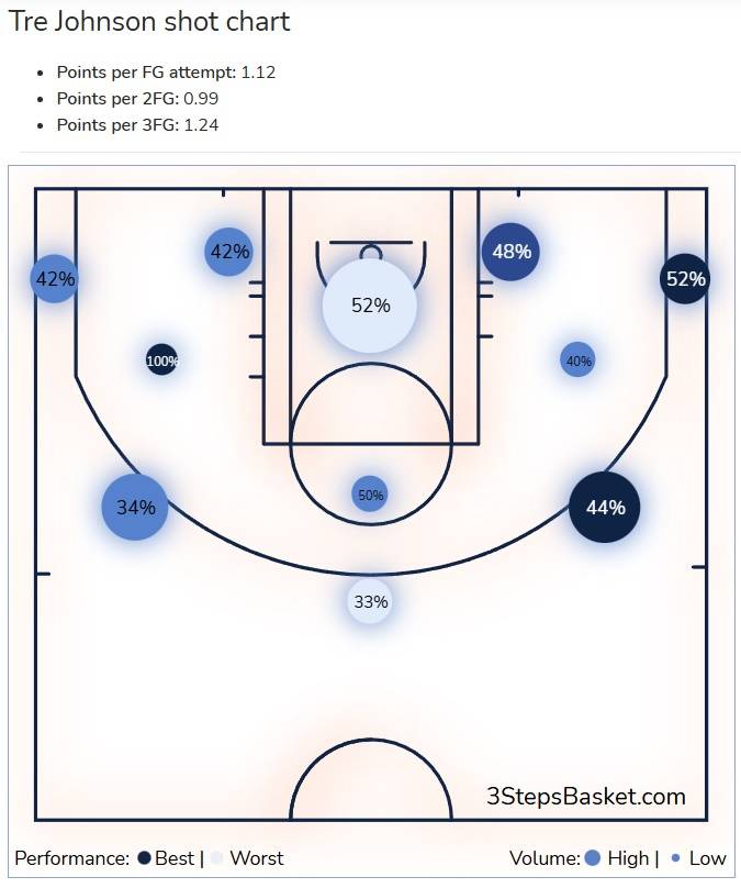 Tre Johnson 平均每一次出手的 PPP 可拿下 1.12分,