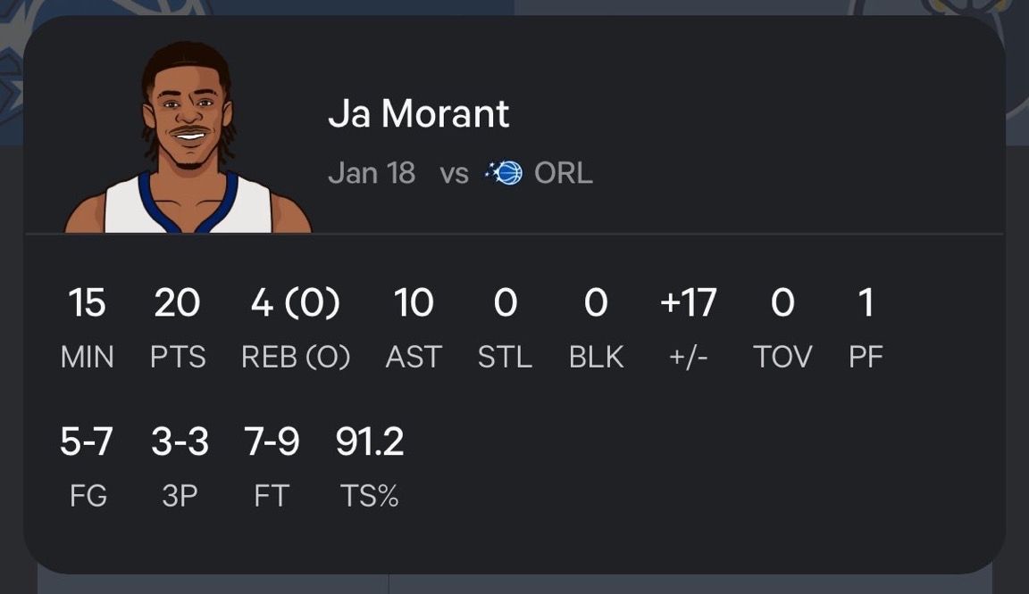 [花邊] Ja成為隊史首位半場20分10助攻球員
