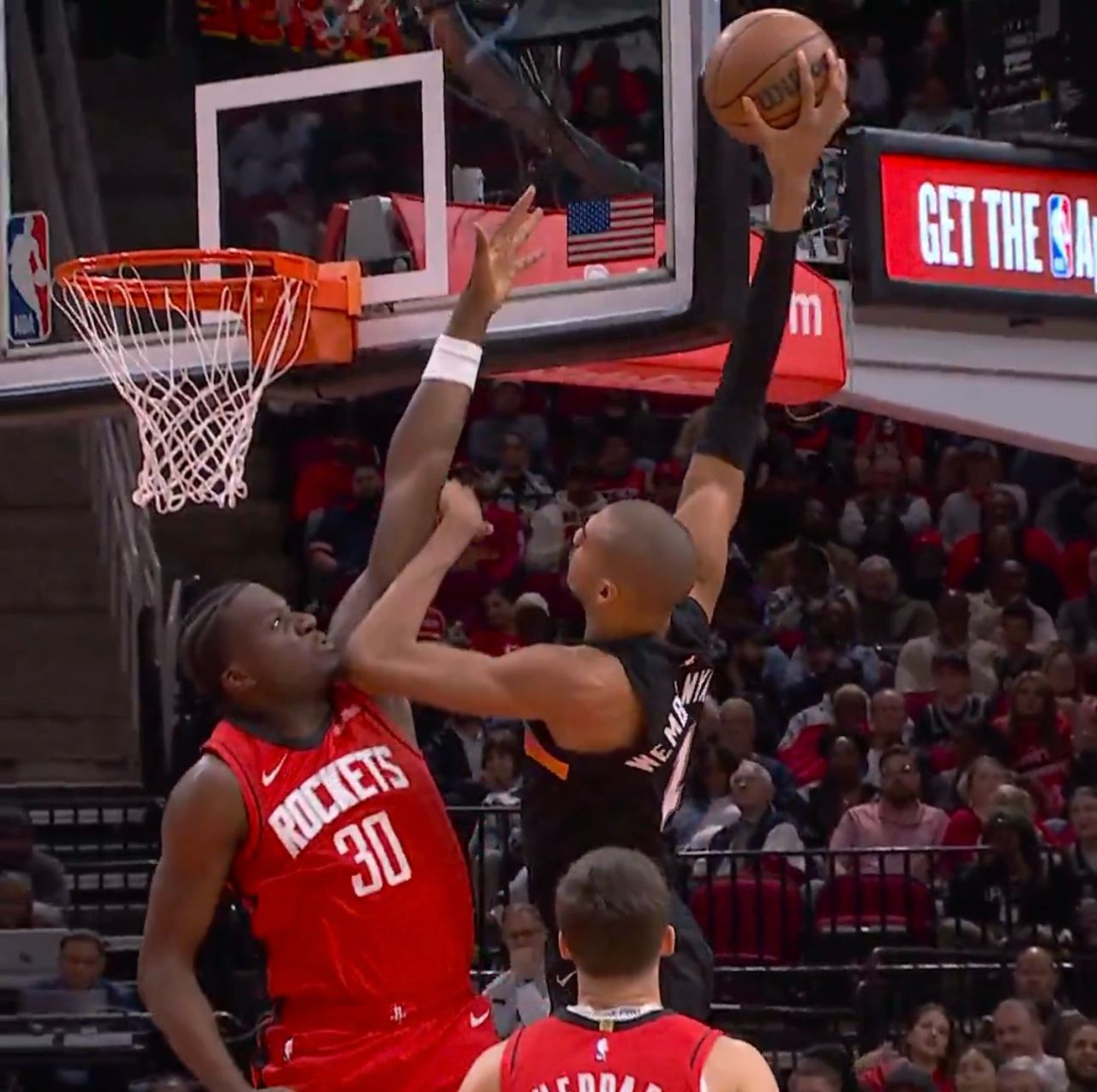 框附近雙方起跳進行攻防,最終文班亞馬在空中撐得比較久,技高一籌上演精采扣籃,場邊