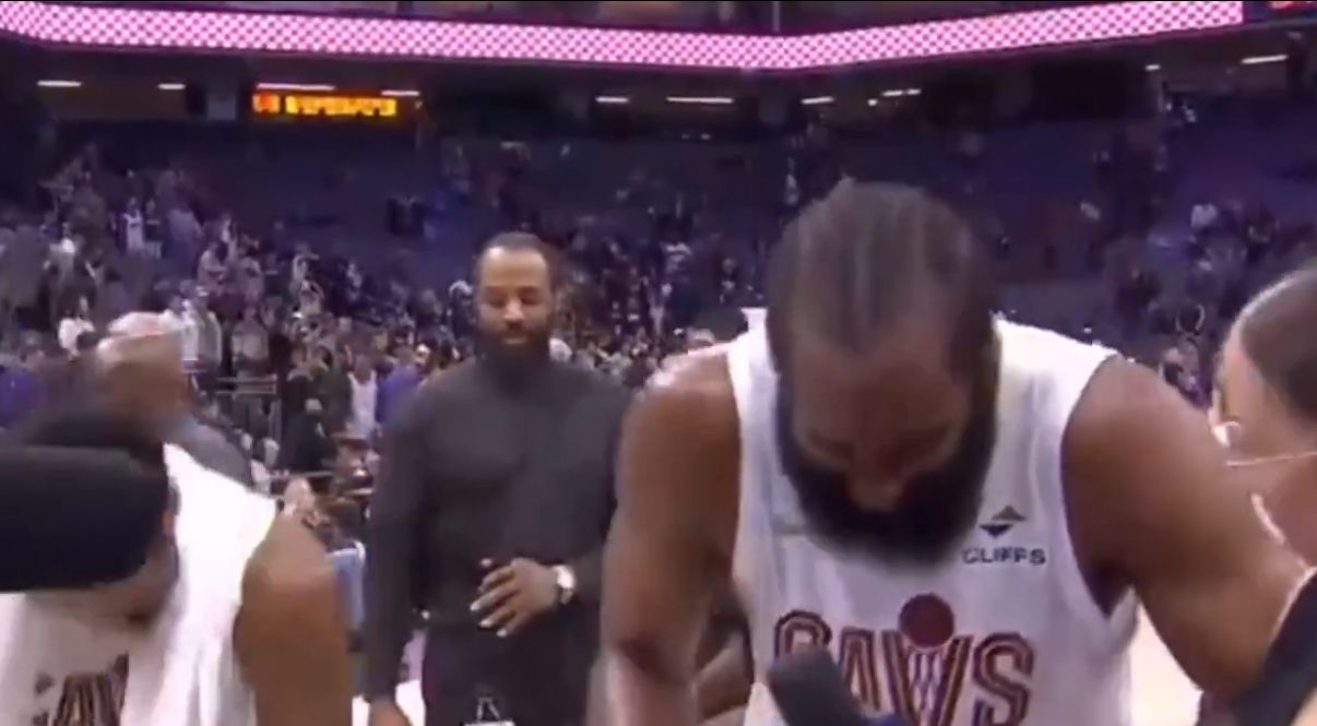 Travis Scott 在 James Harden 加盟騎士後拿下首勝的賽後訪問中突然亂入。