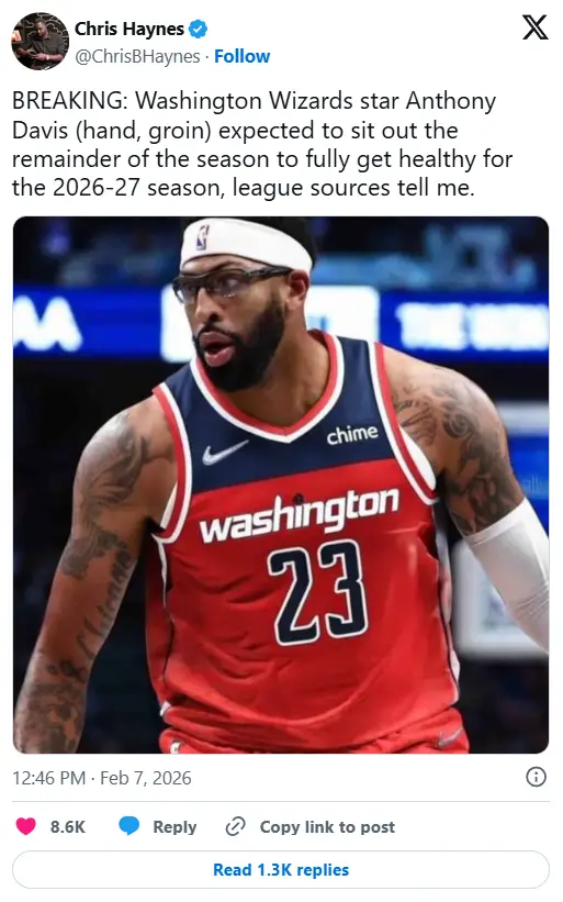 日前《The Athletic》引述匿名消息指出巫師可能讓戴維斯「提前關機」停賽至季末的報