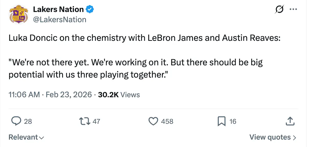 Luka Doncic 談到與 LeBron James 以及 Austin Reaves 的化學反應時表示: