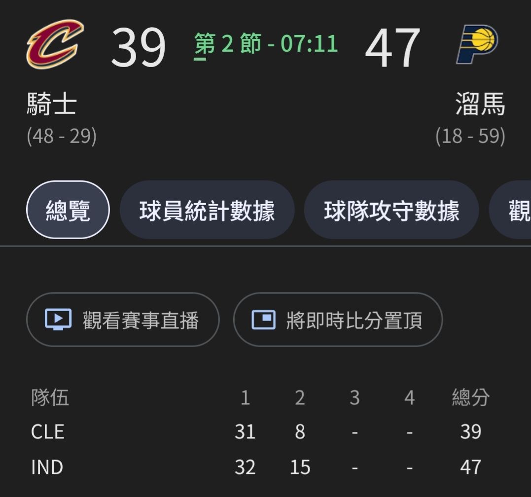印第安納溜馬(18-59) VS 克里夫蘭騎士(48-29)