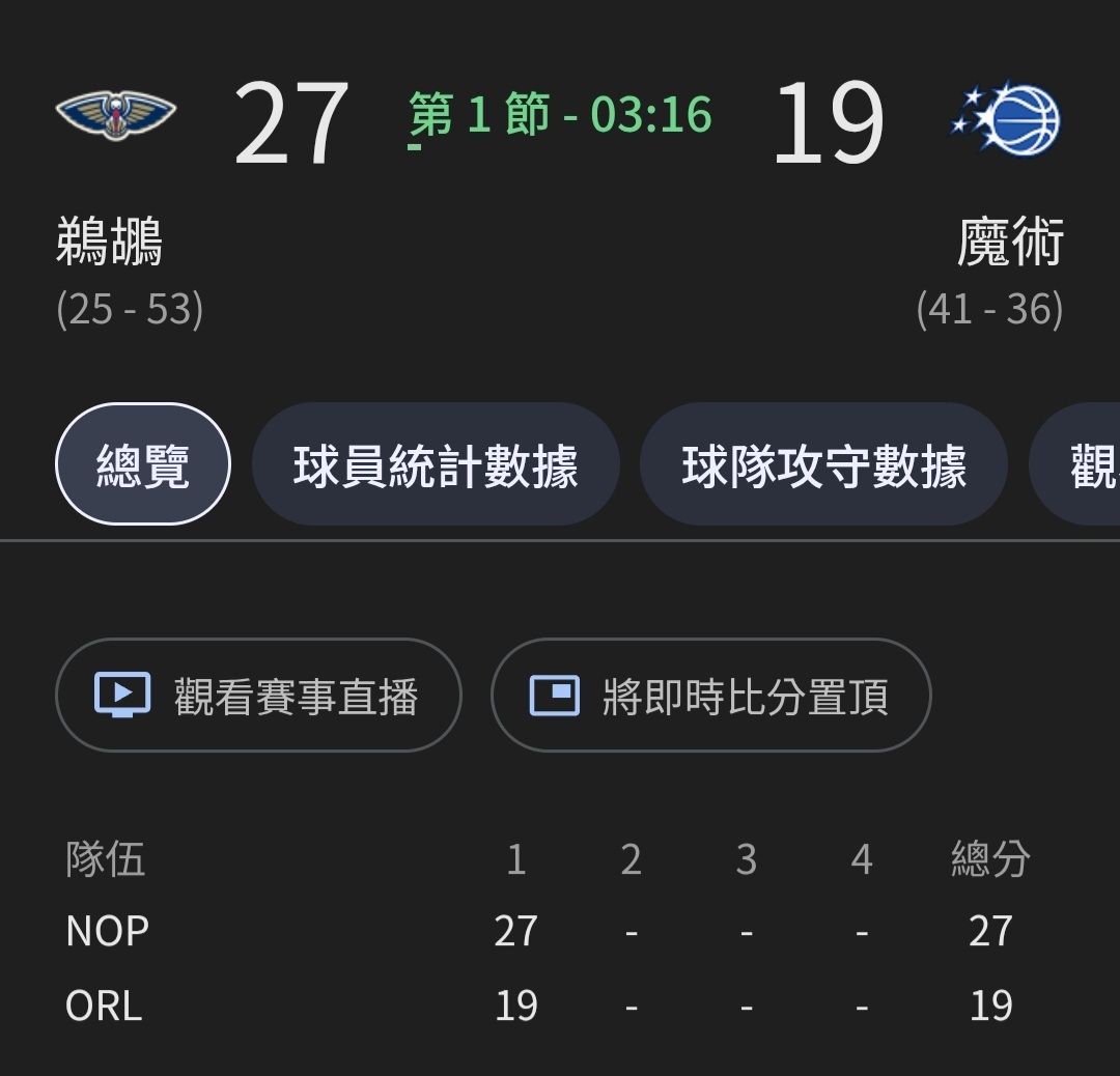 奧蘭多魔術(41-36) VS 紐奧良鵜鶘(25-53)
