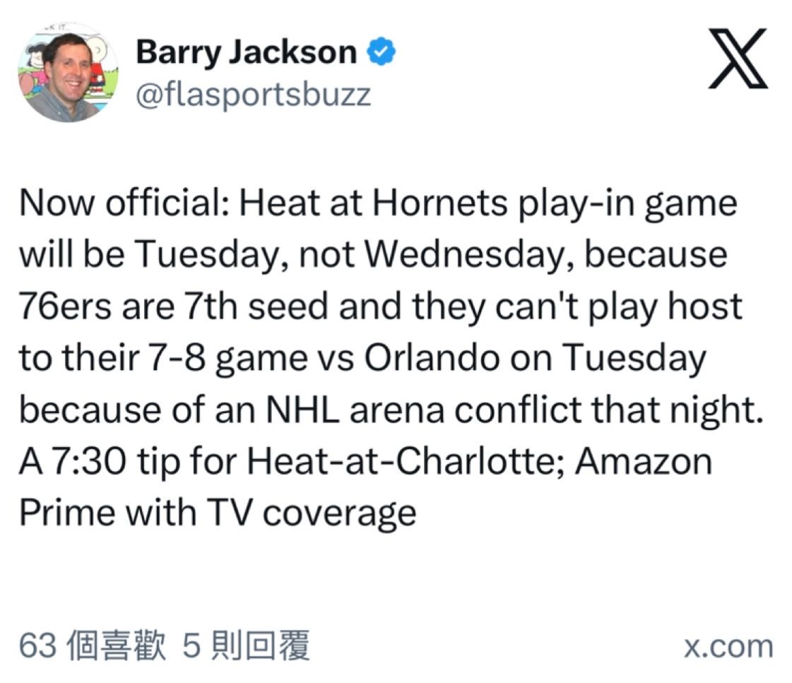 確定了!熱火客場對黃蜂的東區9&10 名附加賽,將會在美國時間週二,而非先前的週三