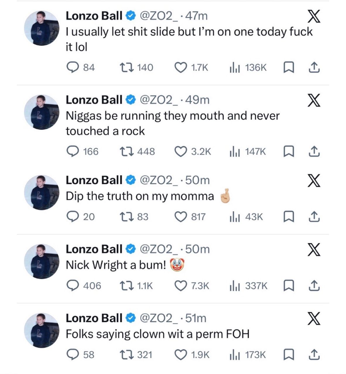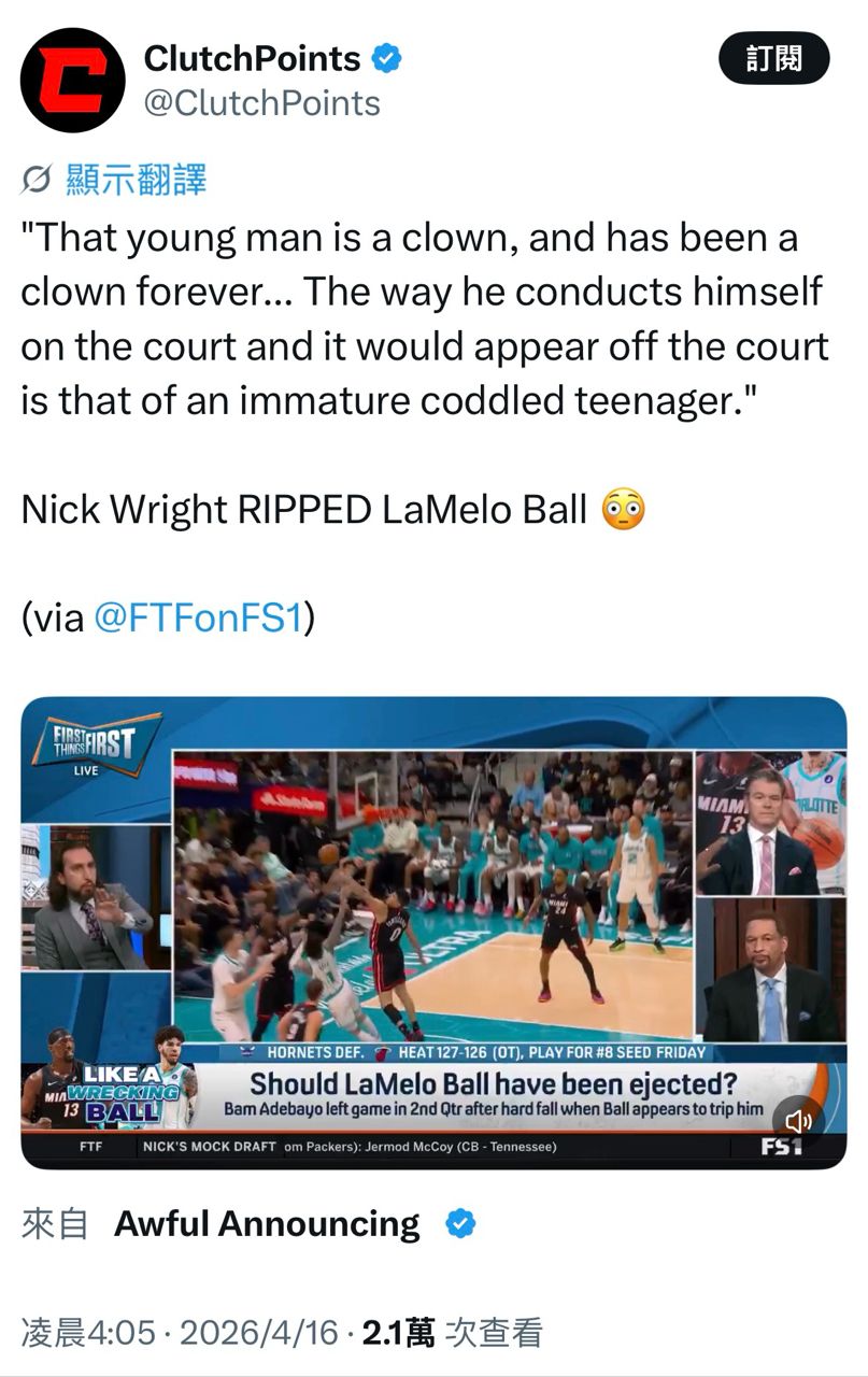 之後球家二代長子Lonzo更是在推特發連串短文,其中一則還指名道姓Nick Wright「也只