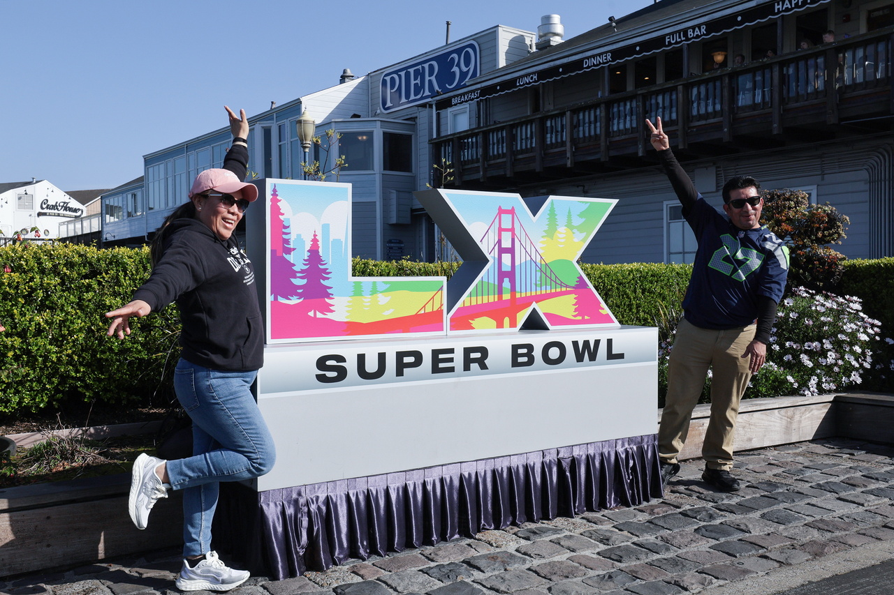 第60屆超級盃8日登場,球迷在舊金山漁人碼頭前與「LX超級盃」標誌合影,LX是羅馬數