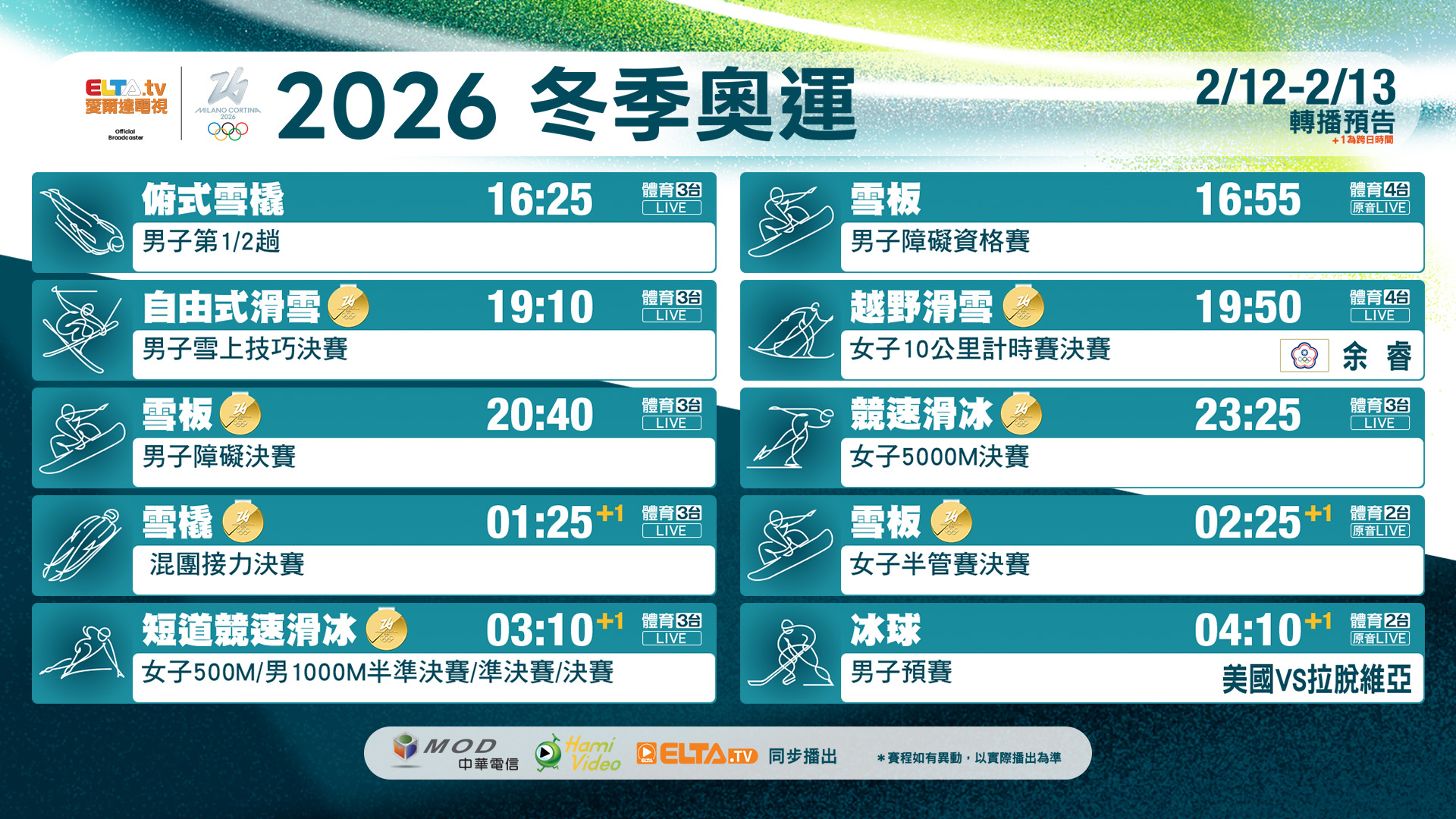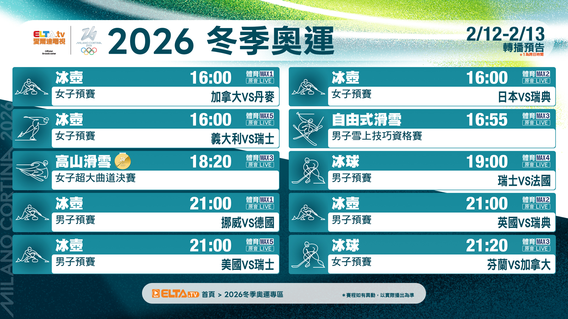 [奧運] 米蘭-科爾蒂納冬奧 ELTA 2/12-13 轉播預告