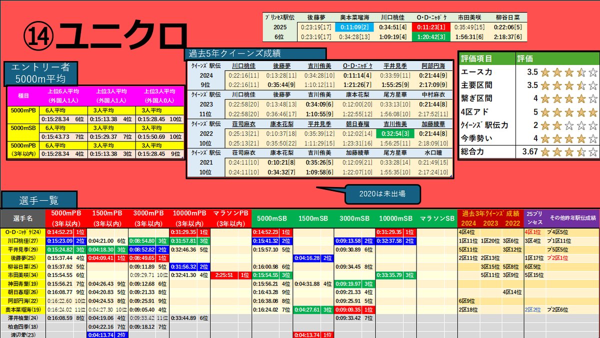 例如NO.14 UNIQLO平常單項賽個人成績不錯,但駅伝表現通常不佳。