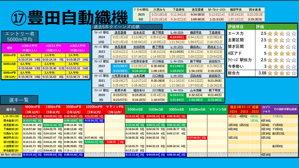 ⑰豊田自動織機(前回12位、プリンセス9位)