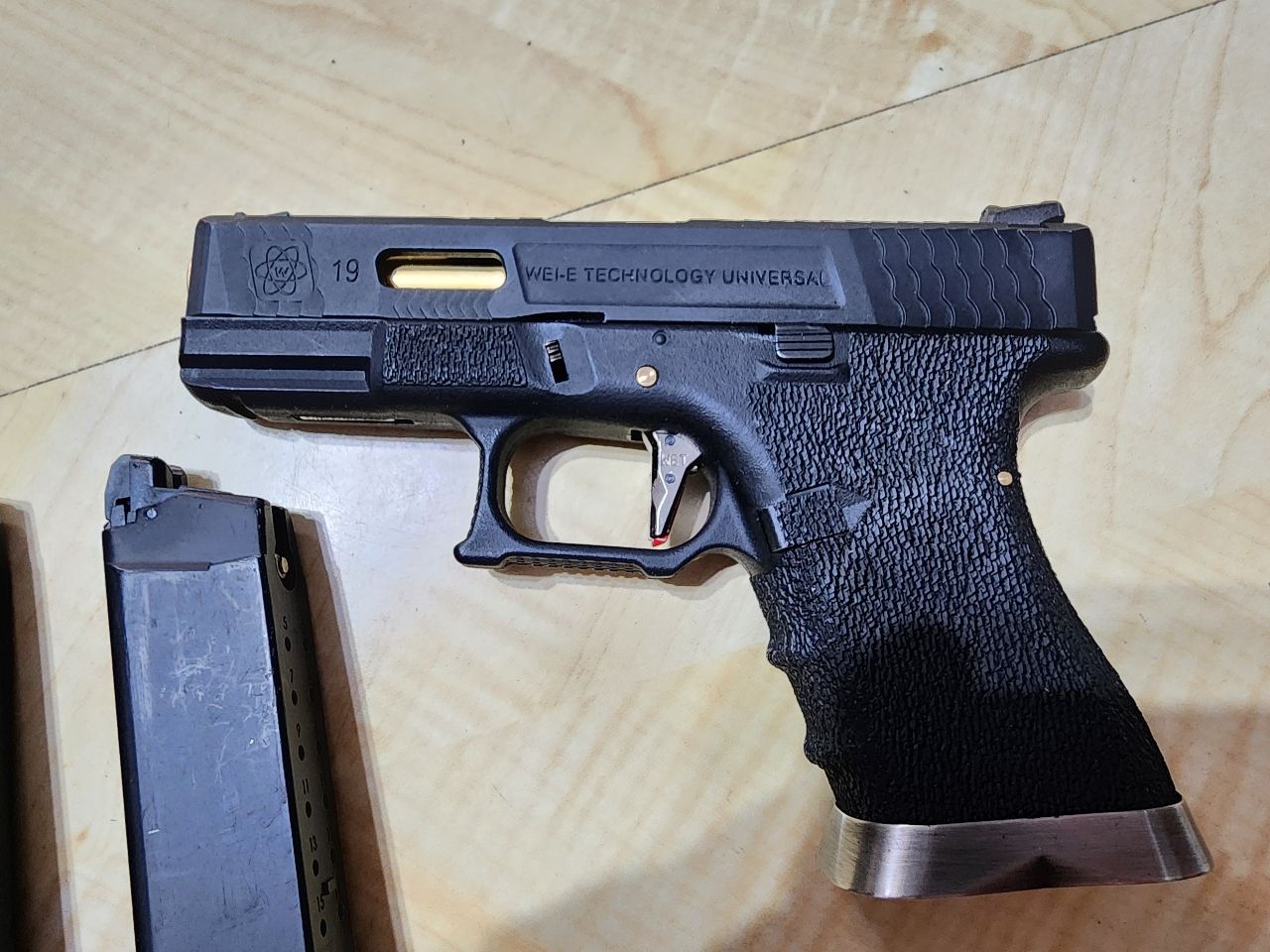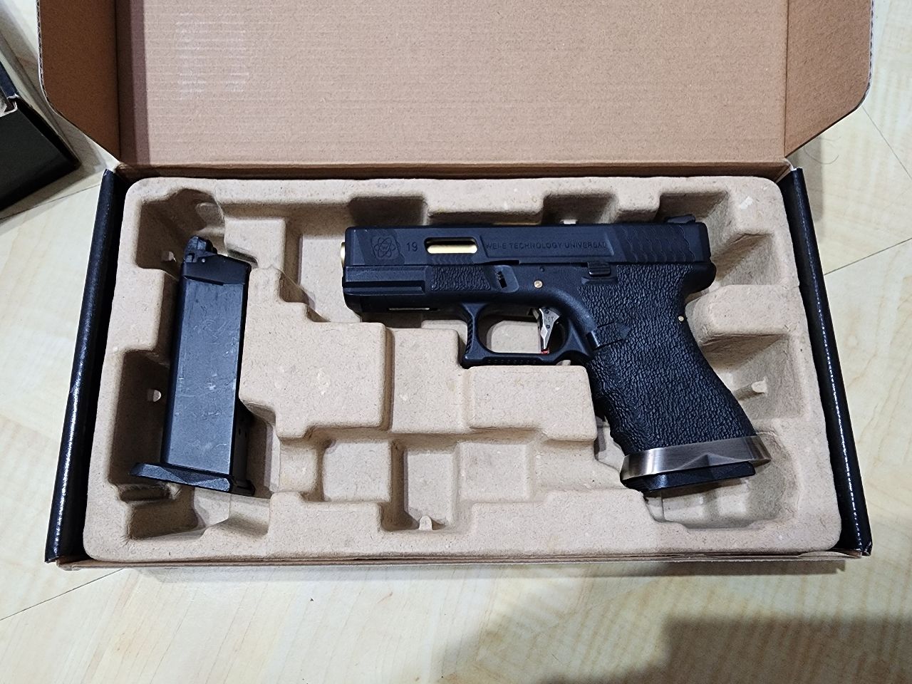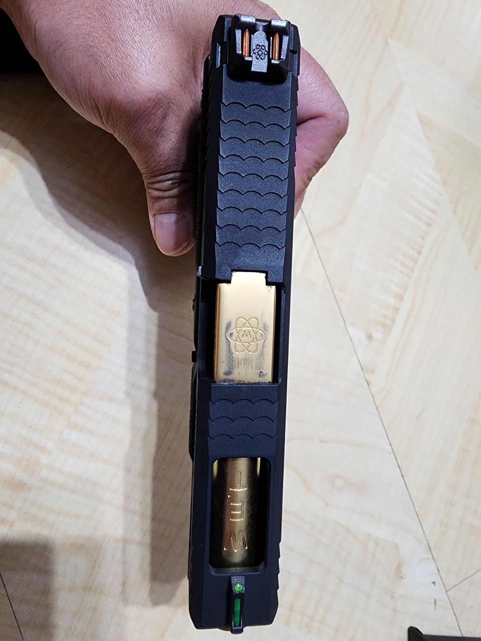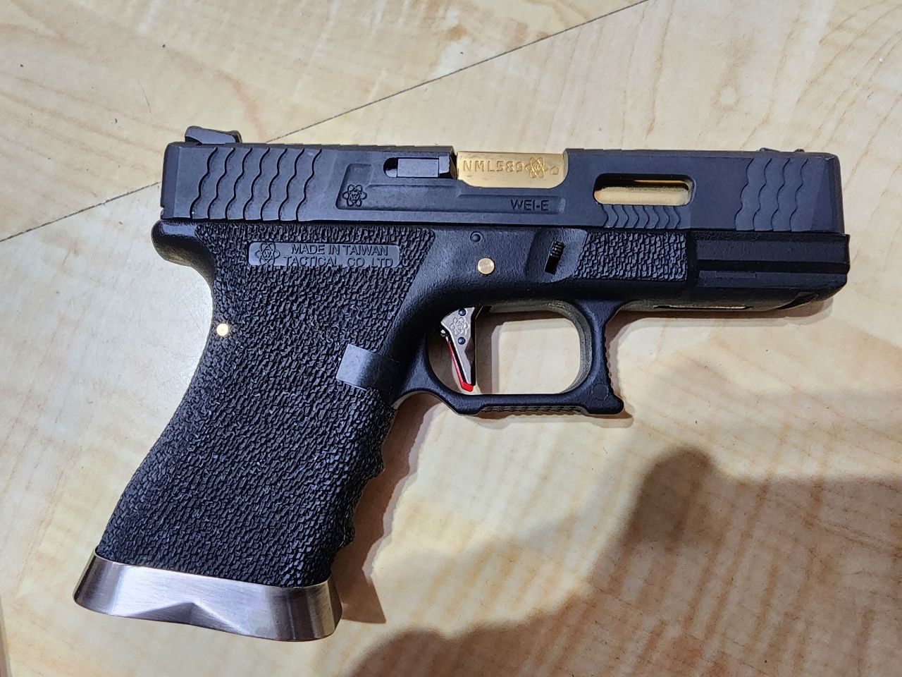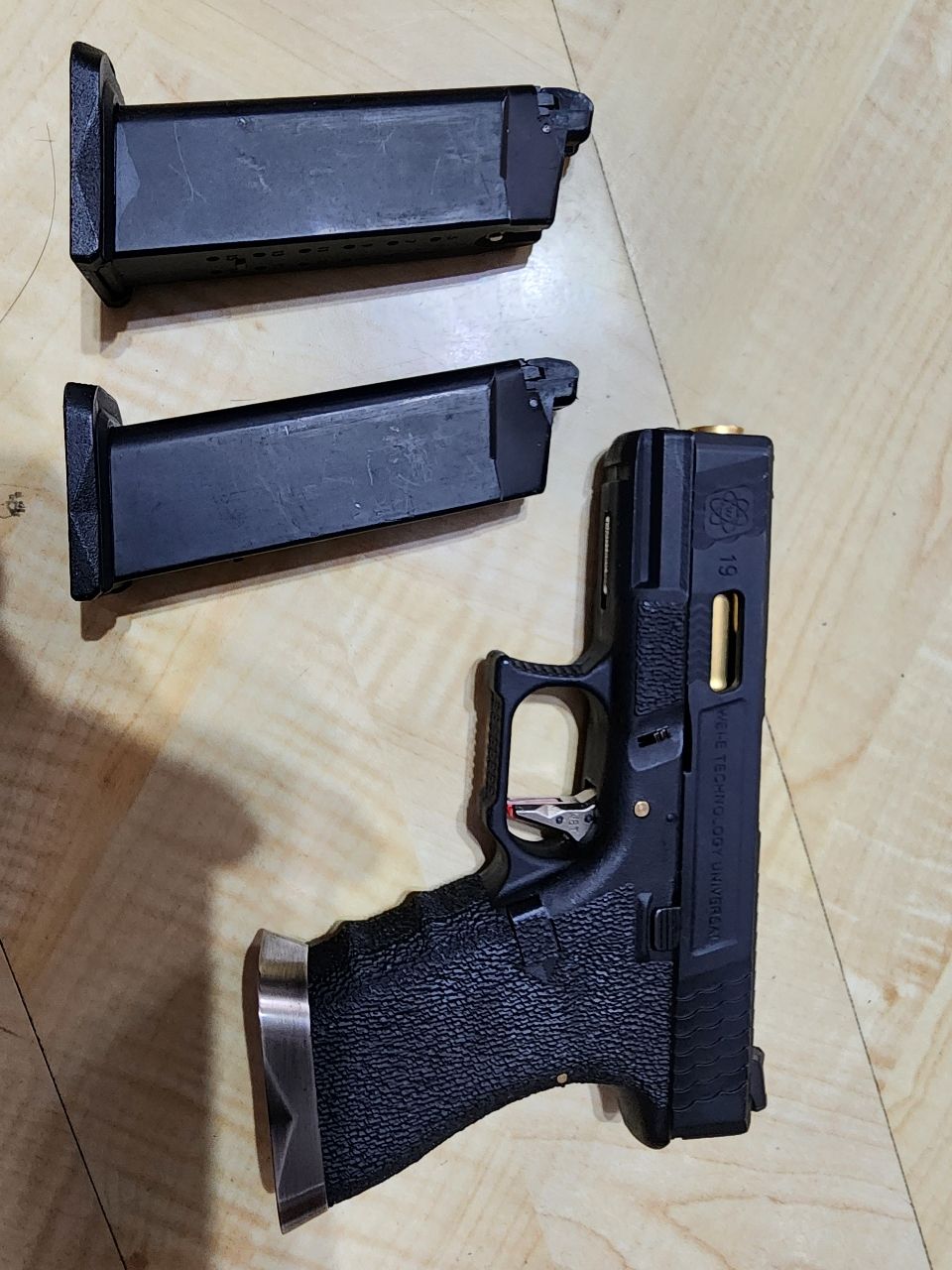 一槍兩匣,整體約九成新,下場過兩次,主要是在外槍管上方有些磨痕(如圖),槍身沒