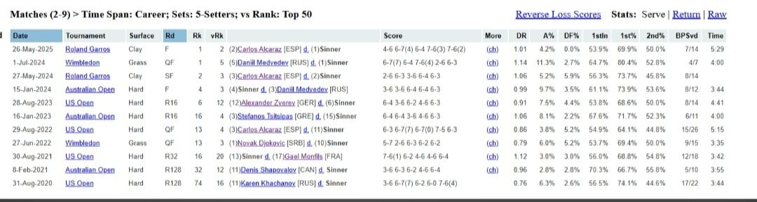 [討論] Sinner生涯第五盤對戰世界排名前50的戰績