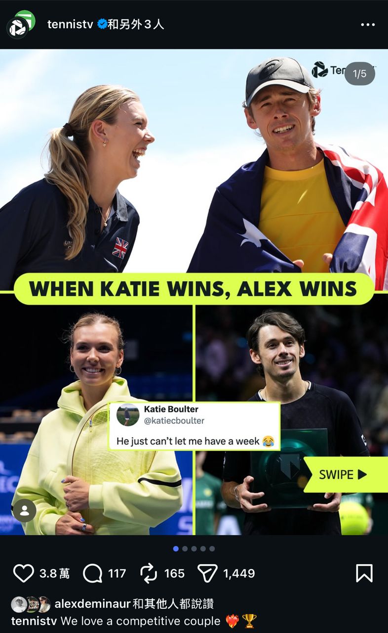 會不會是未婚妻Katie Boulter前一週拿下冠軍所帶來的加成呢??