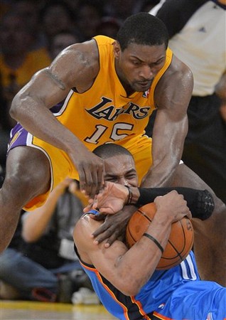 西區湖人與雷霆對戰戲碼中,世界和平(Metta World Peace)儼然成為場內、外的另一個
