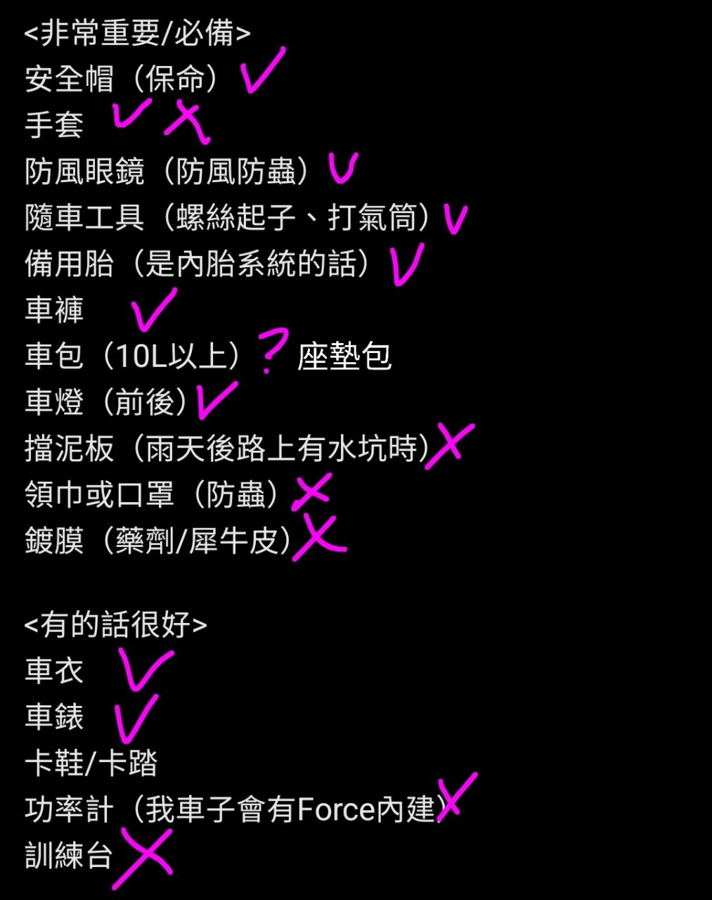 我會放「有的話很好」的是基於我這幾趟騎起來後的感覺好像非必要的東西。
