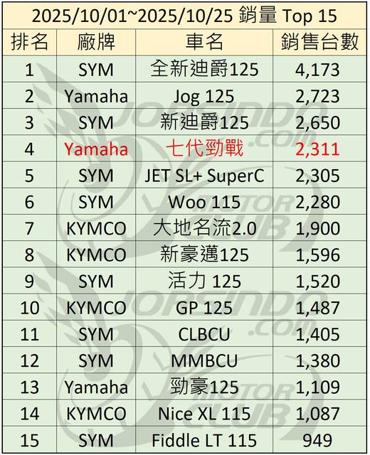 2025年10月機車銷售前15名車款