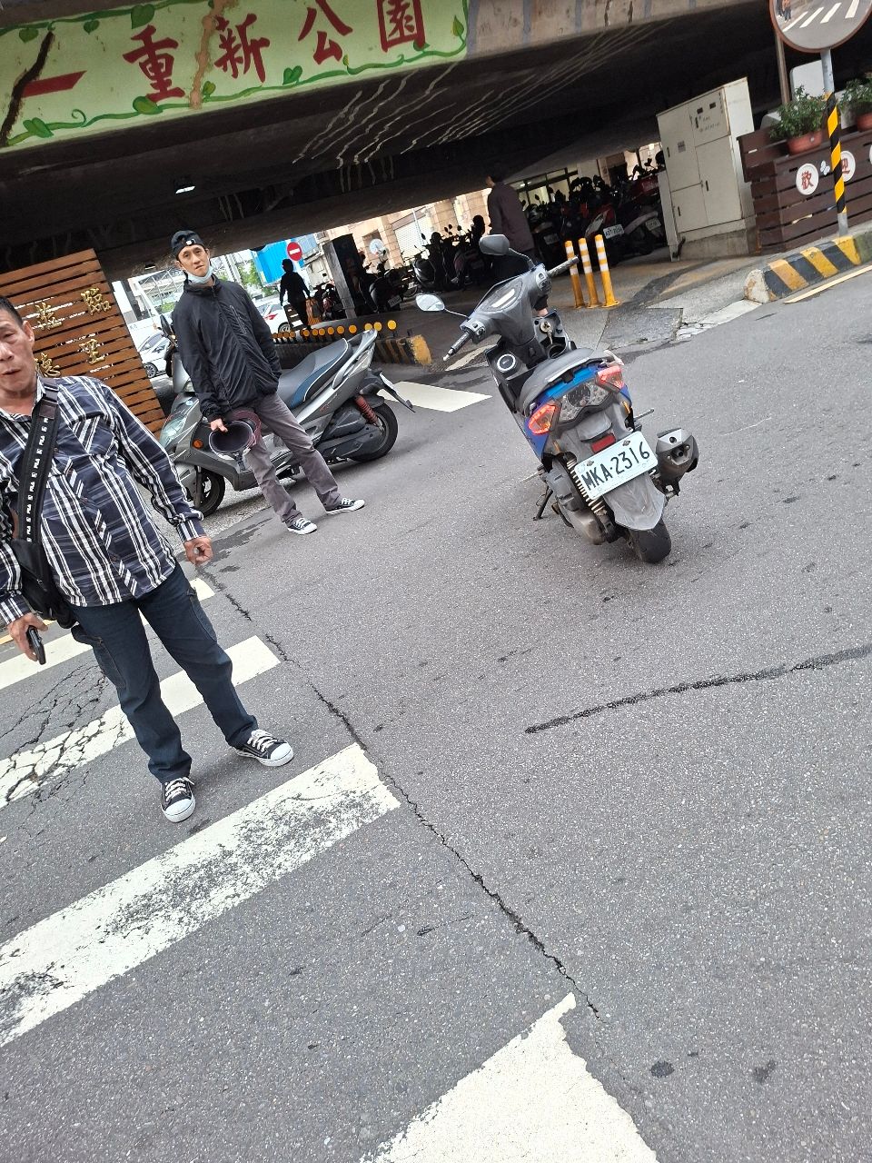 於是他騎到幾乎橋下的斑馬線停下來