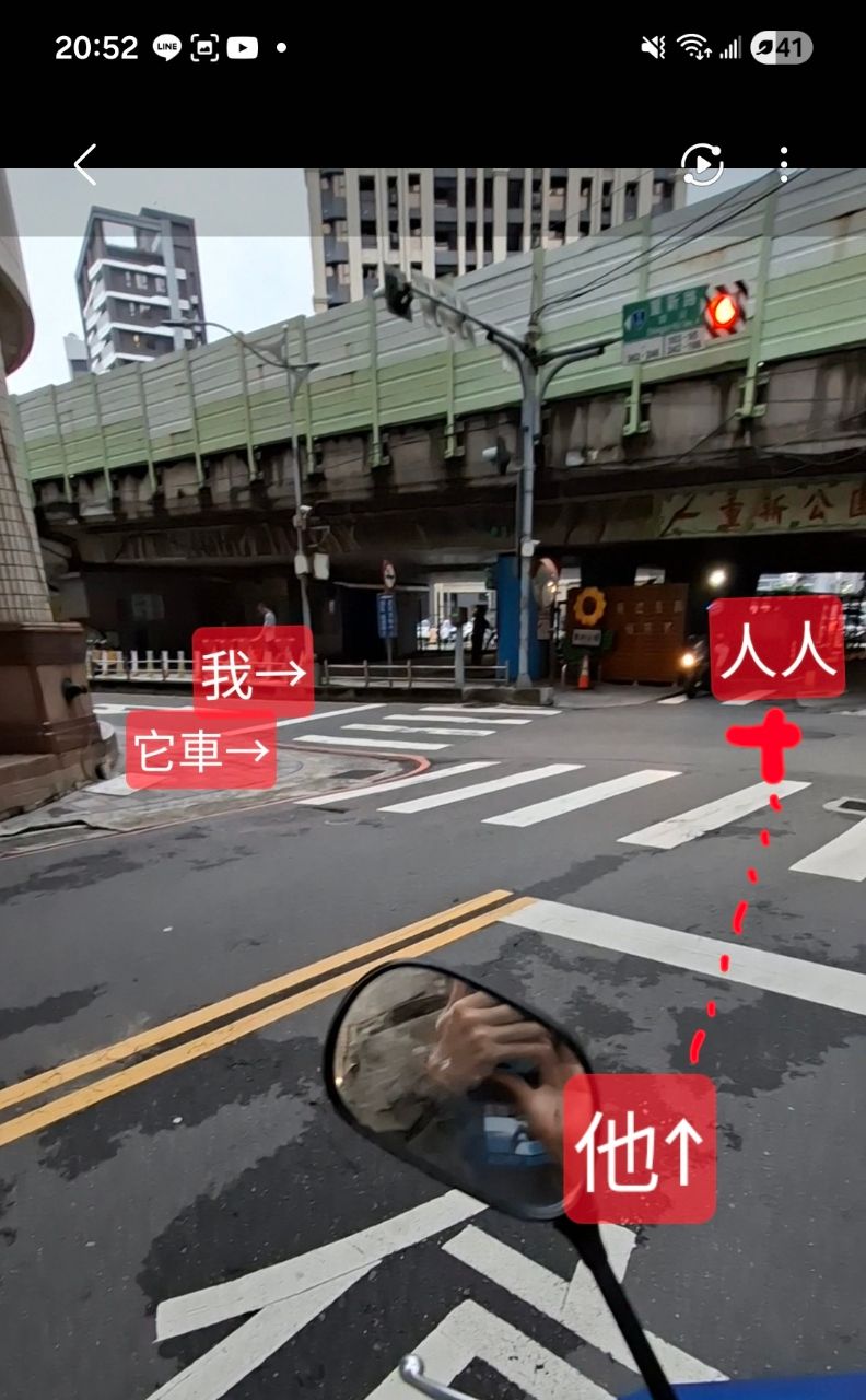 他幾乎在路口中,停駛,我右邊也有機車,沒得閃