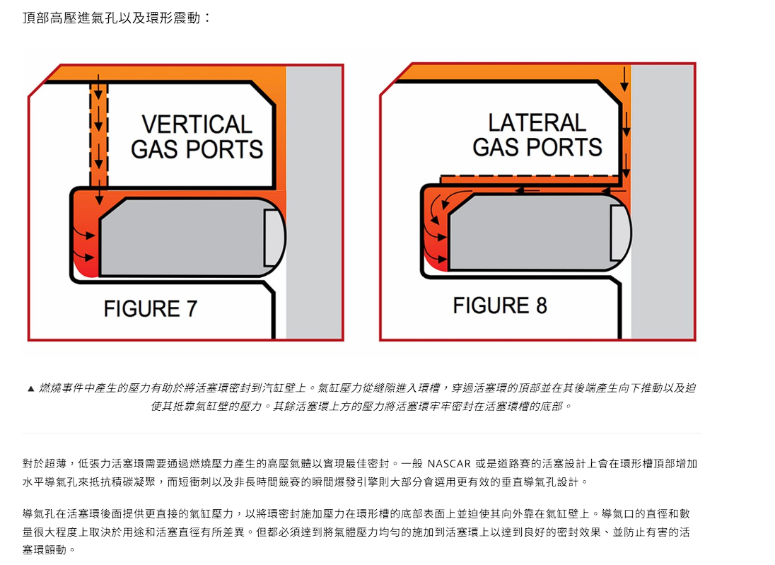 活塞環的運作原理是利用引擎室爆炸的吹漏氣與壓力 將活塞環撐開貼著汽缸