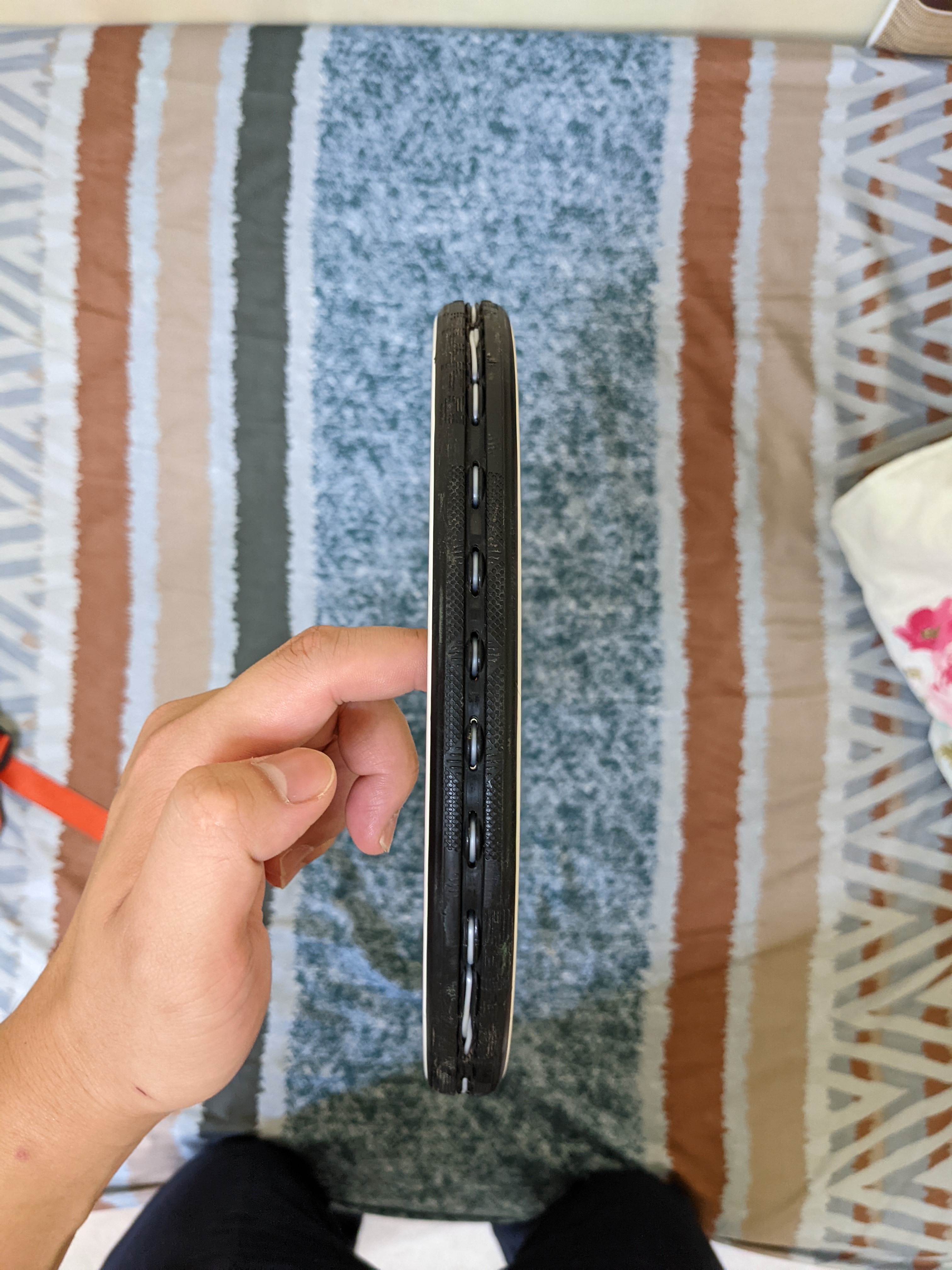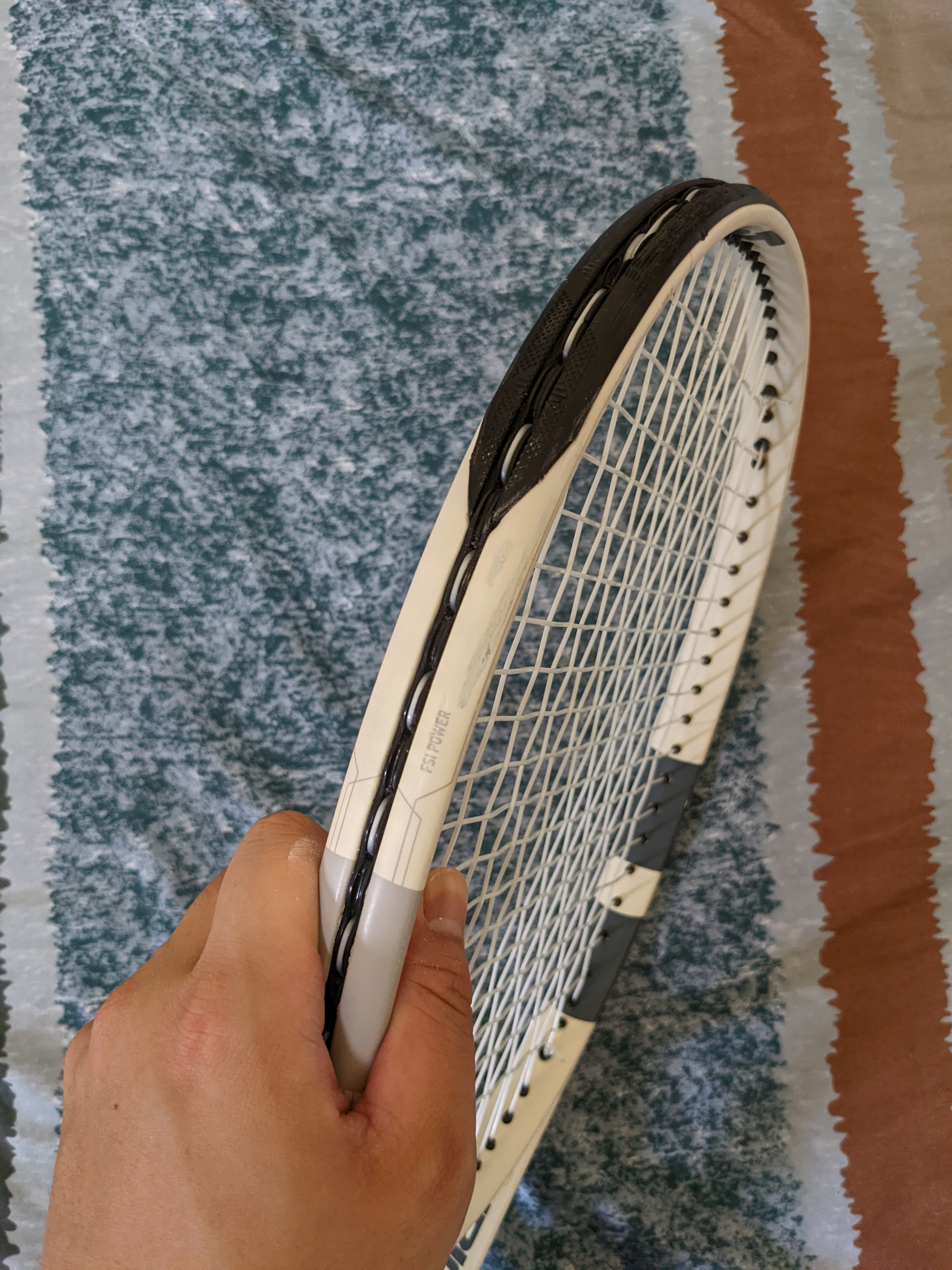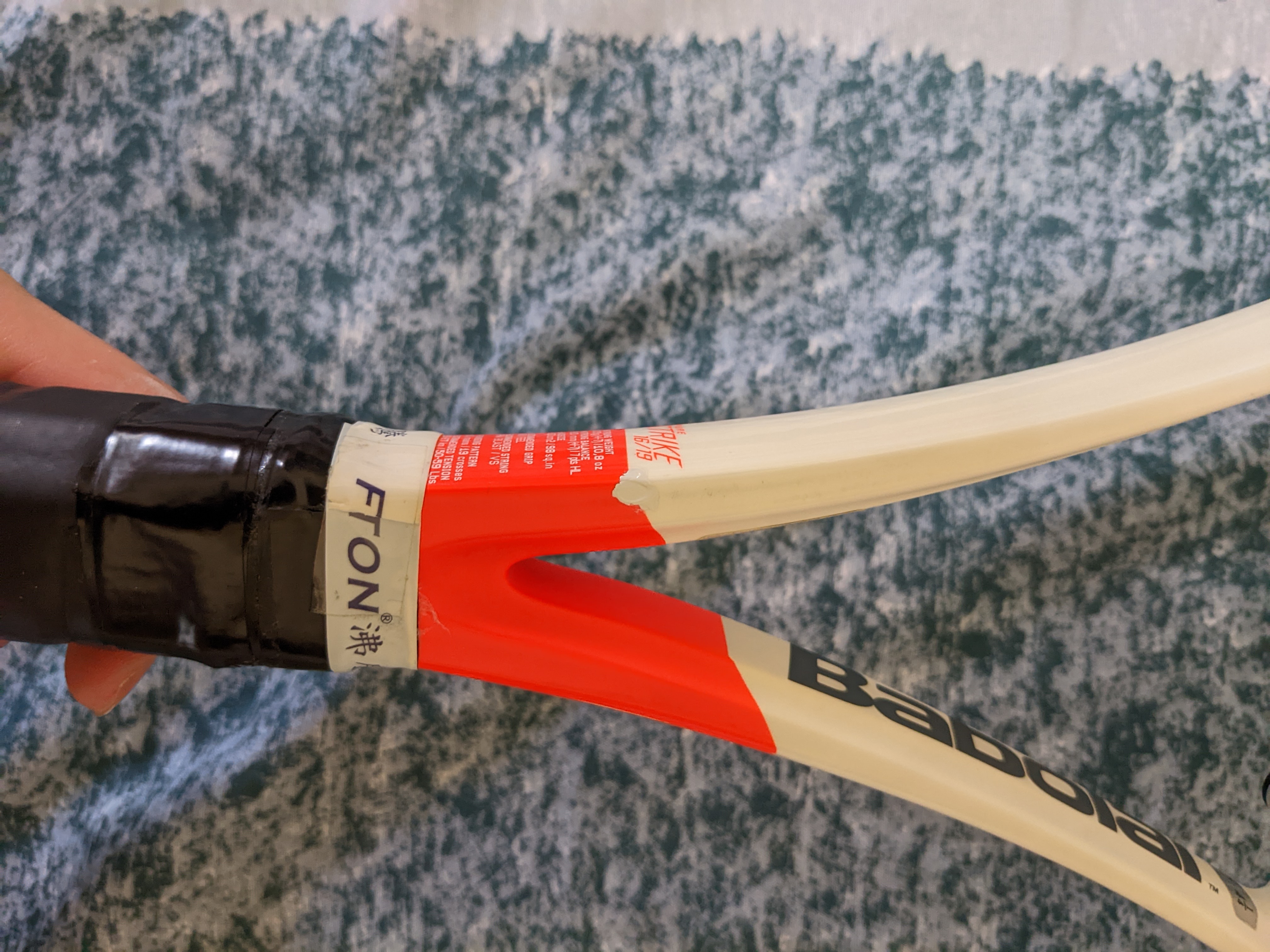 使用概況:約8成新球拍,拍框有一處補漆、拍頸米粒大小掉漆,護框條正常使用痕跡,